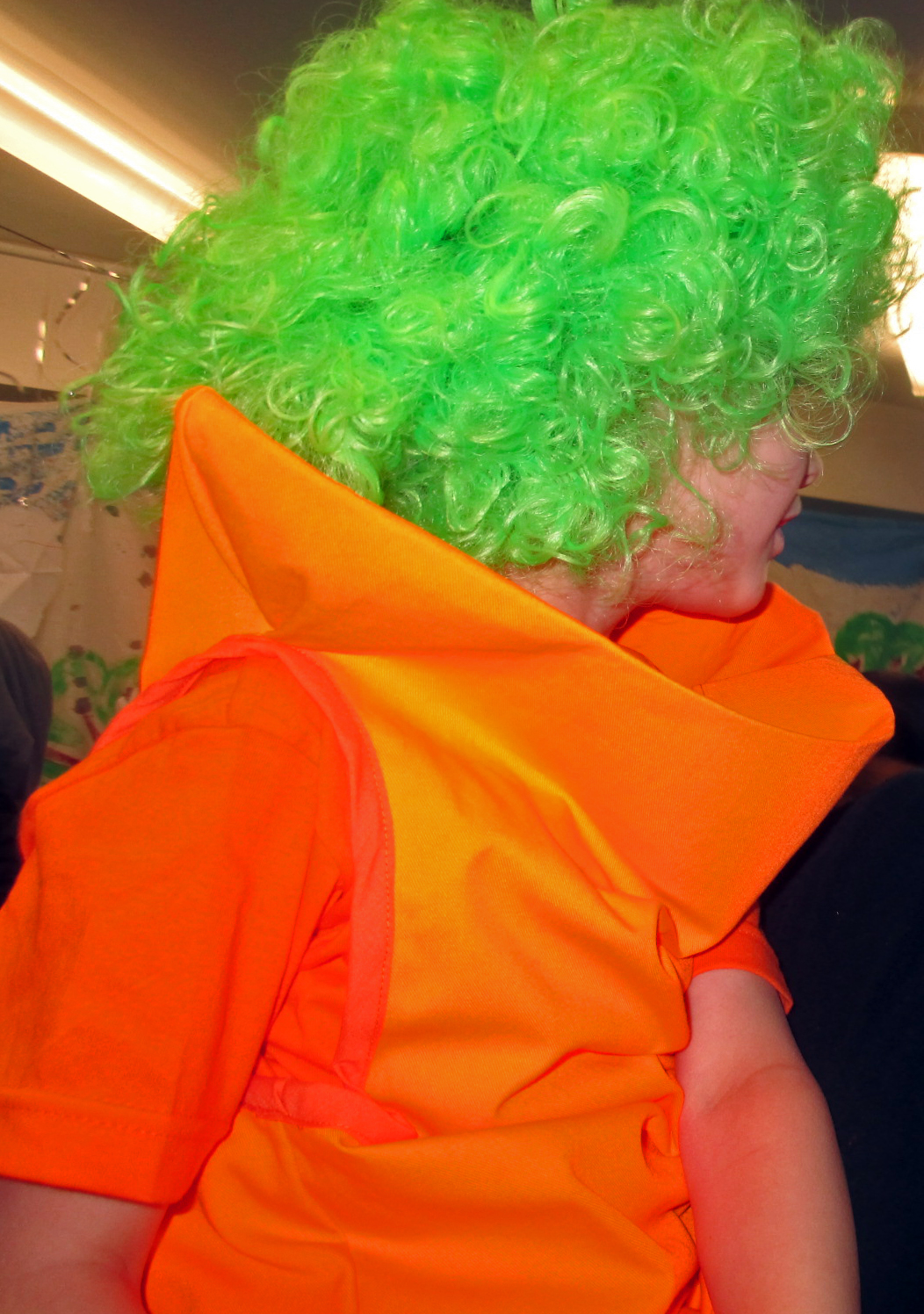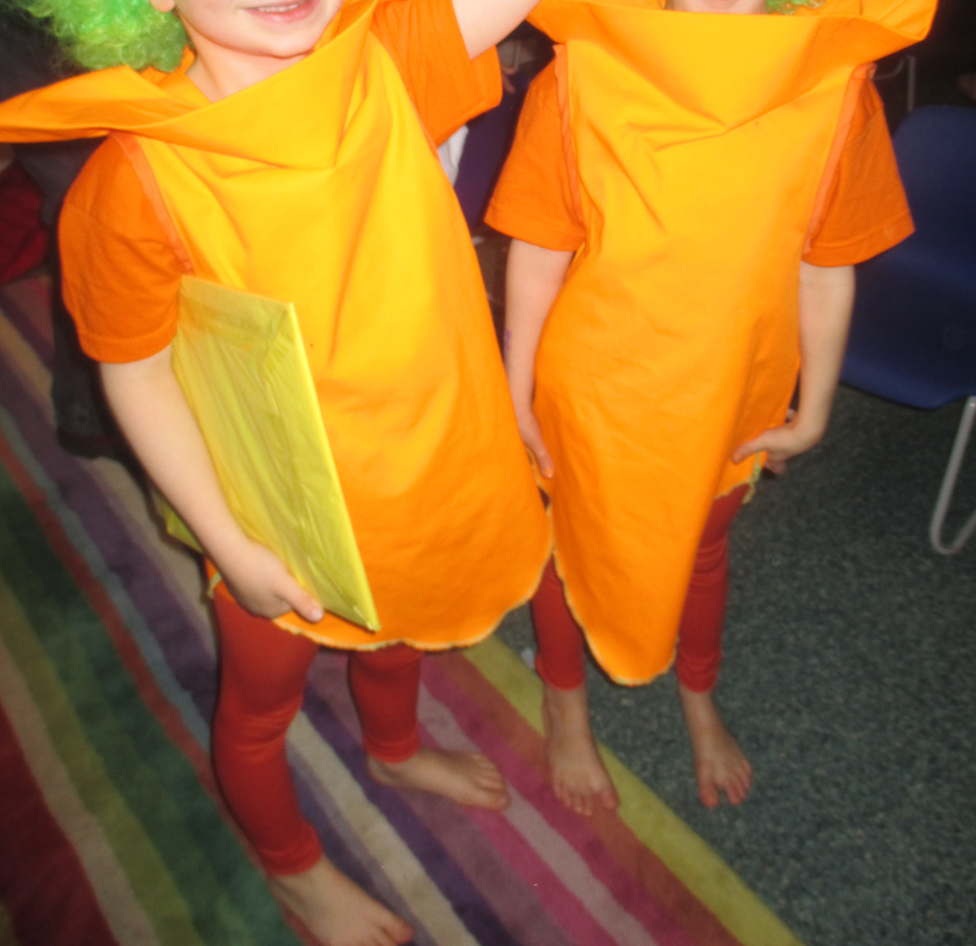When they had asked me if I couldn’t whip up two carrot costumes, I was briefly looking for my magic wand but went then straight to the fabric shop to get some kind of orange material. It might have been the influence of the magic wand, it might have been the very soft light in the shop but I only realised at home that the orange was slightly on the neon side and was a bit worried. But when I saw the wigs that the teacher had organised, I knew that my intuition had just chosen the perfect match.