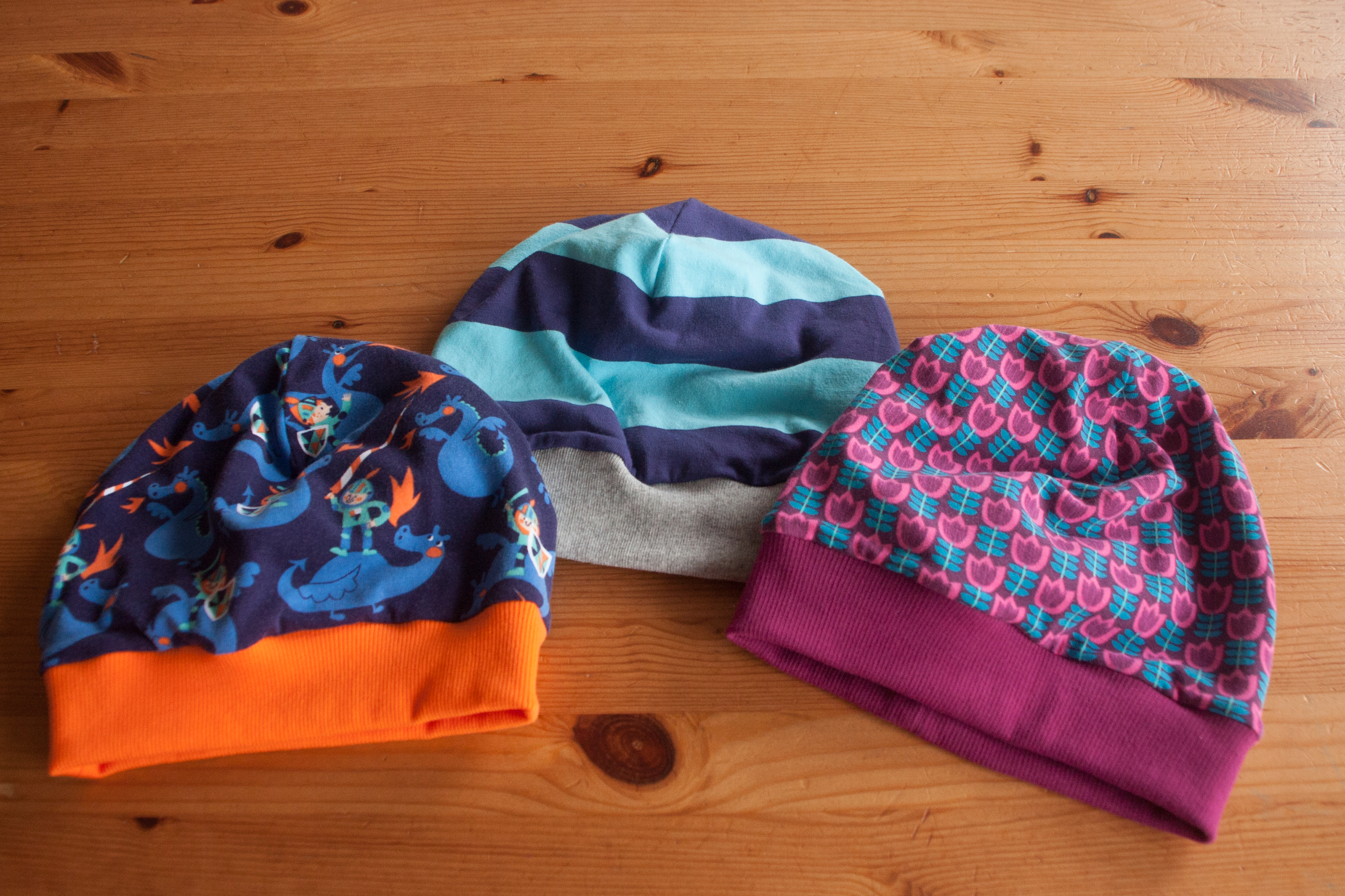 I also made a few more hats for my nephew and nieces using up some jersey. They requested beanies and as I am obsessed with the idea of reversible hats (no ugly seams inside plus getting to use two lovely fabrics instead of just one), I went for the version with ribbing at the bottom. I am not entirely convinced about the ribbing but I haven’t seen them on the heads in question. The pattern is the same klimperklein e-book as before.