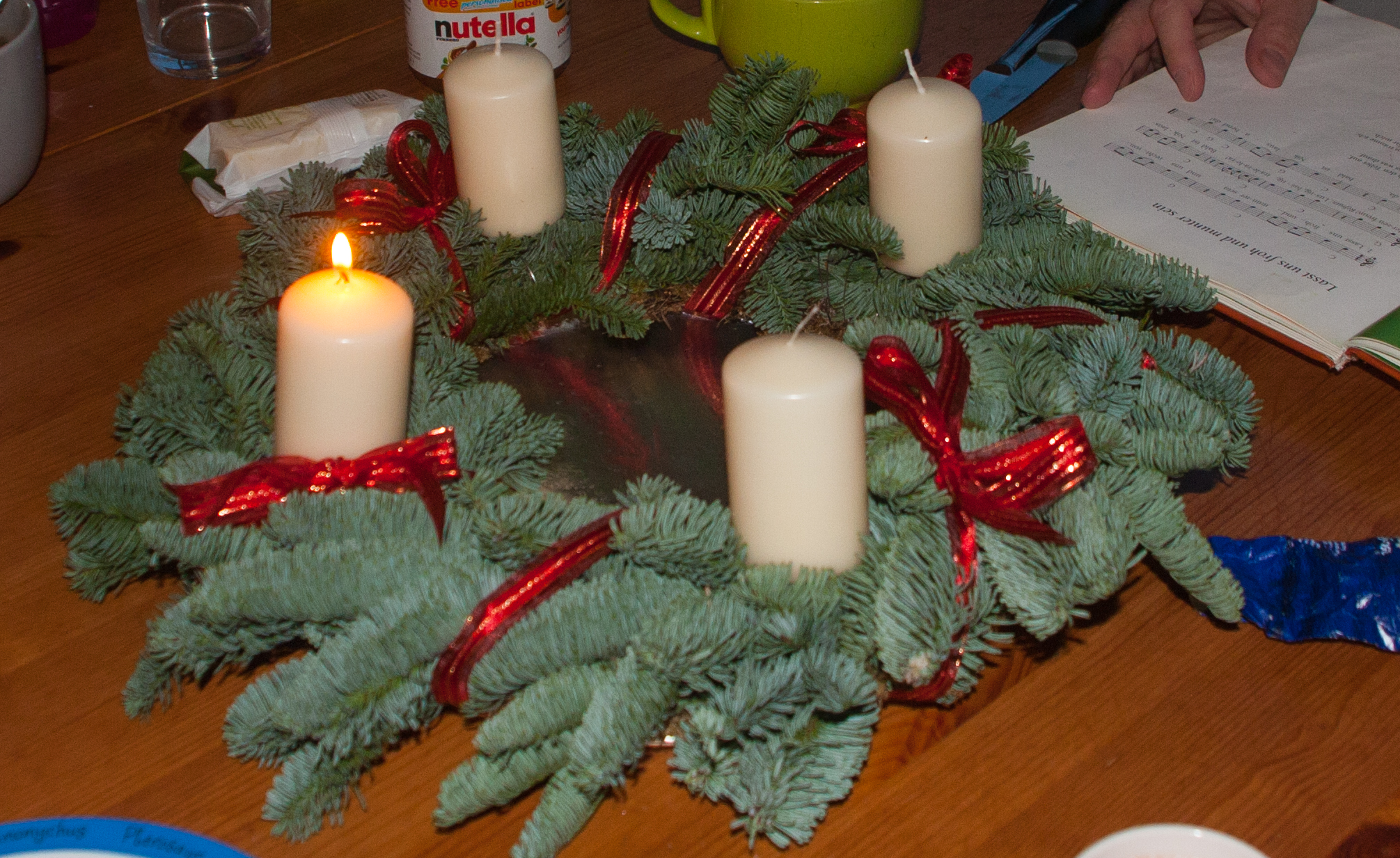 This is our advent wreath. I bought the wreath and put the candles and the ribbon on myself. I guess, one can tell 🙂