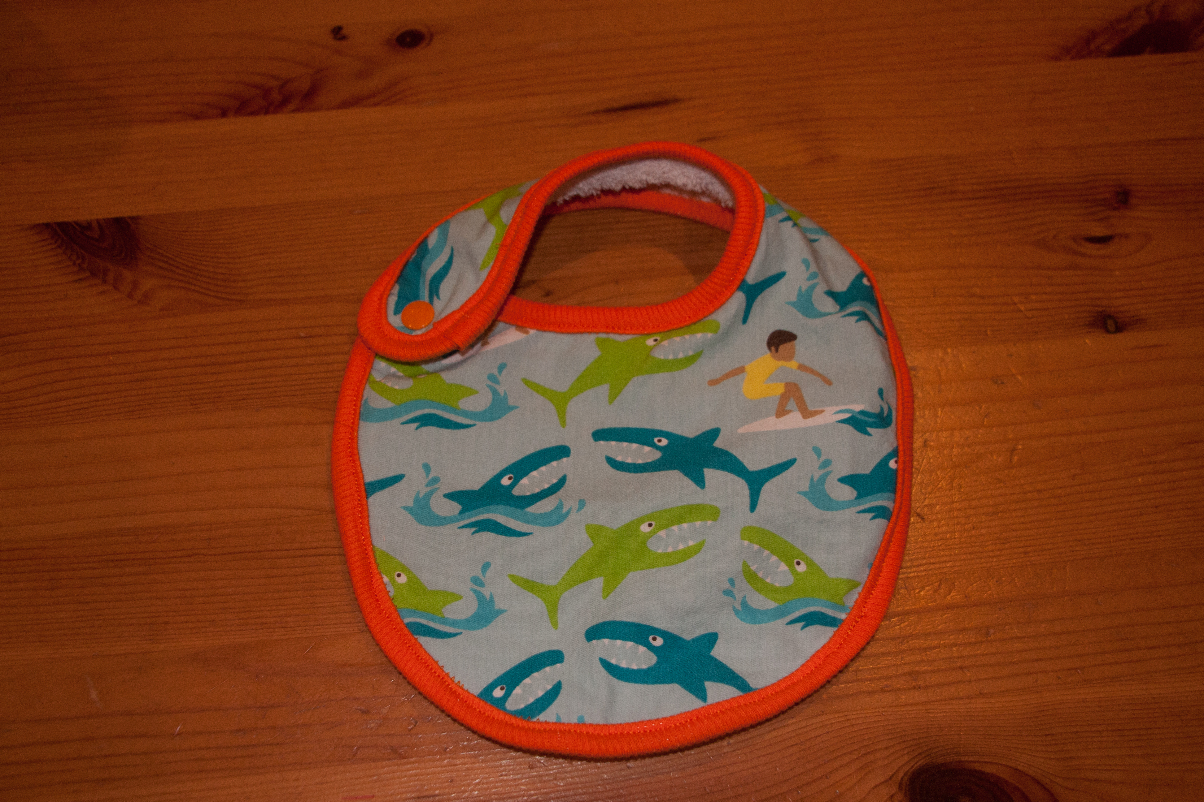 You have already seen these twos: a layer of a nice jersey on top with an old towel at the back, both held together with a contrasting binding made of ribbing. The pirate bib is made using the free pattern from Hamburger Liebe, however I quickly made my own pattern to be able to have the button on the side rather than at the back. Much better for tiny babies who lazily lounge around the whole day.