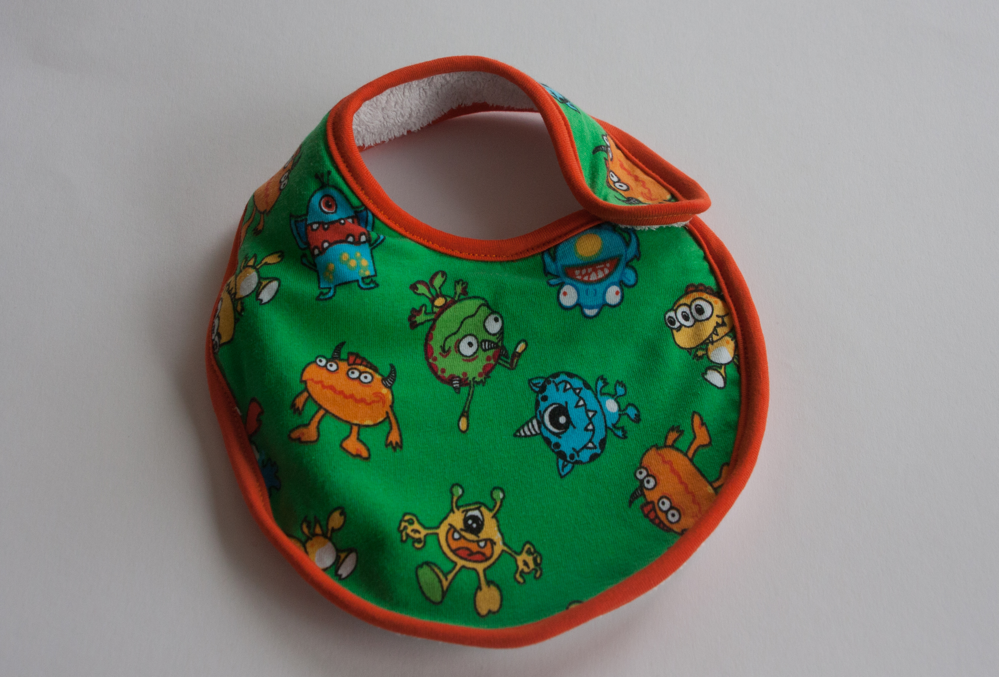 The last bib I have made so far has no contrasting binding. I put both fabrics right sides together, stitched around, leaving a little gap to turn the whole thing inside out, trimmed the seam allowance (before turning obviously) and top stitched which closed as well the little gap.