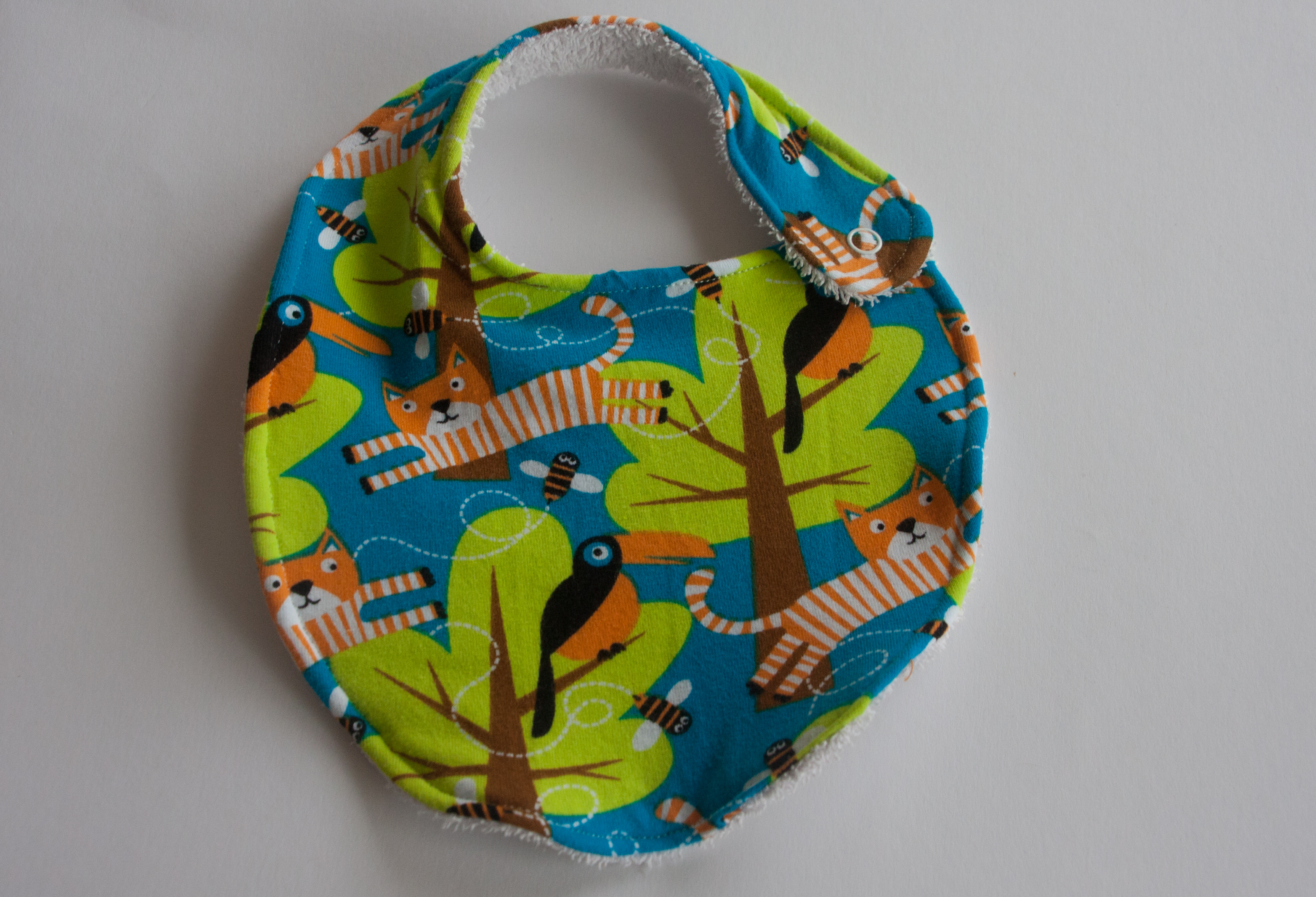It looks a bit more boring but was definitely even quicker to make. I also underestimated how loose the neckline will suddenly be without the stretchy binding. This bib does not sit very snug around the neck so it is not very efficient (nothing a second button couldn’t fix though).