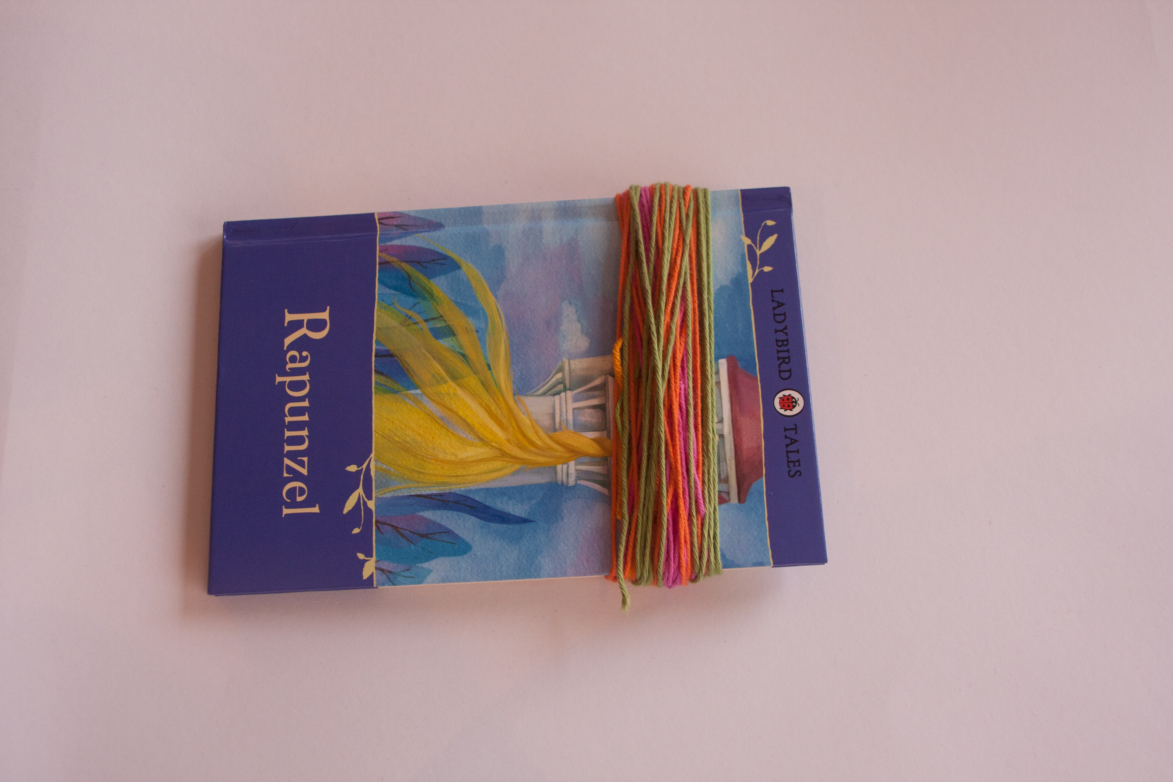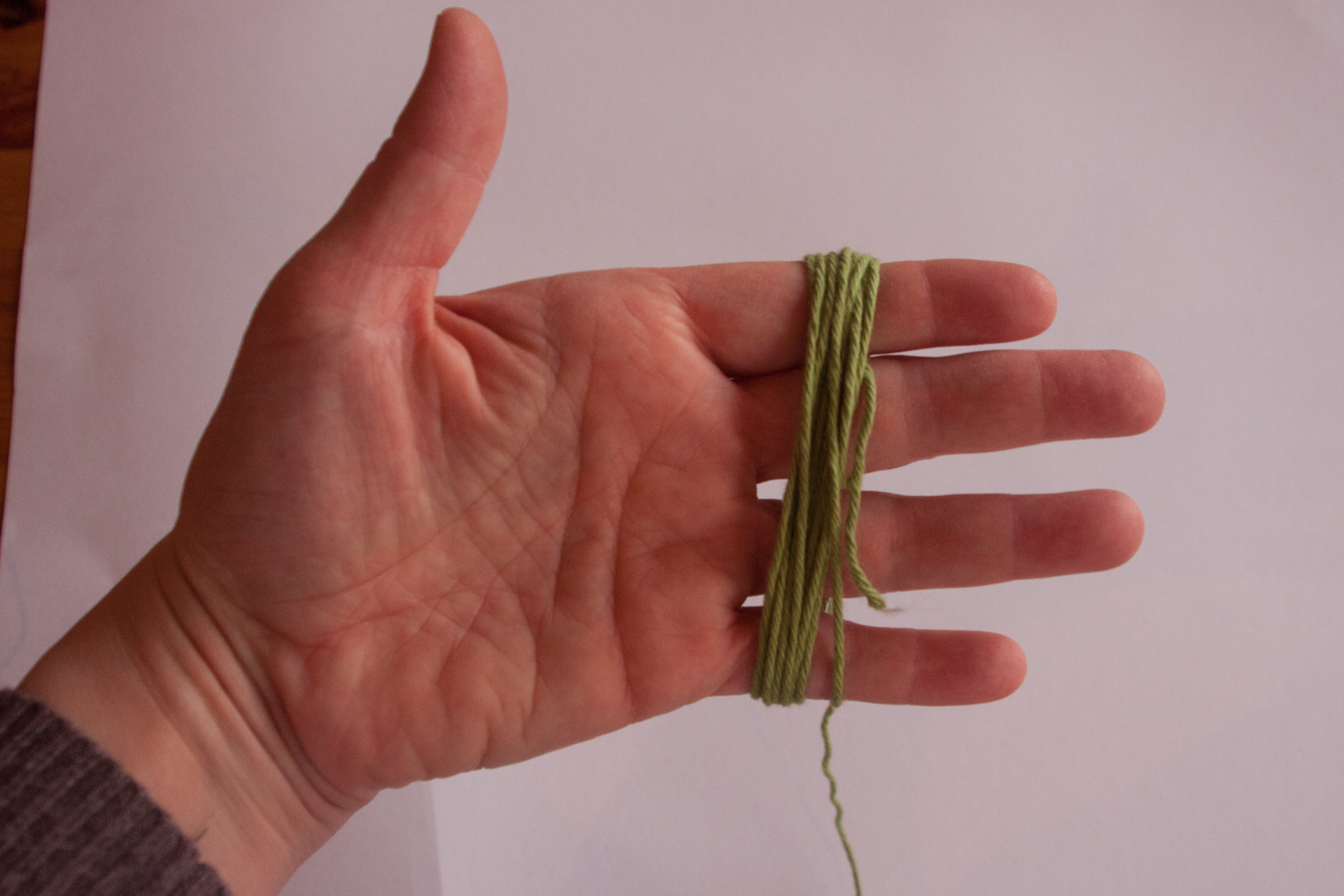 Then, you wind the yarn around a book for a slightly bigger doll or a postcard or even just your fingers. The latter will result in a tiny strand of yarn (especially if you were using a child’s fingers), this would be good for the arms of the second type of dolls.