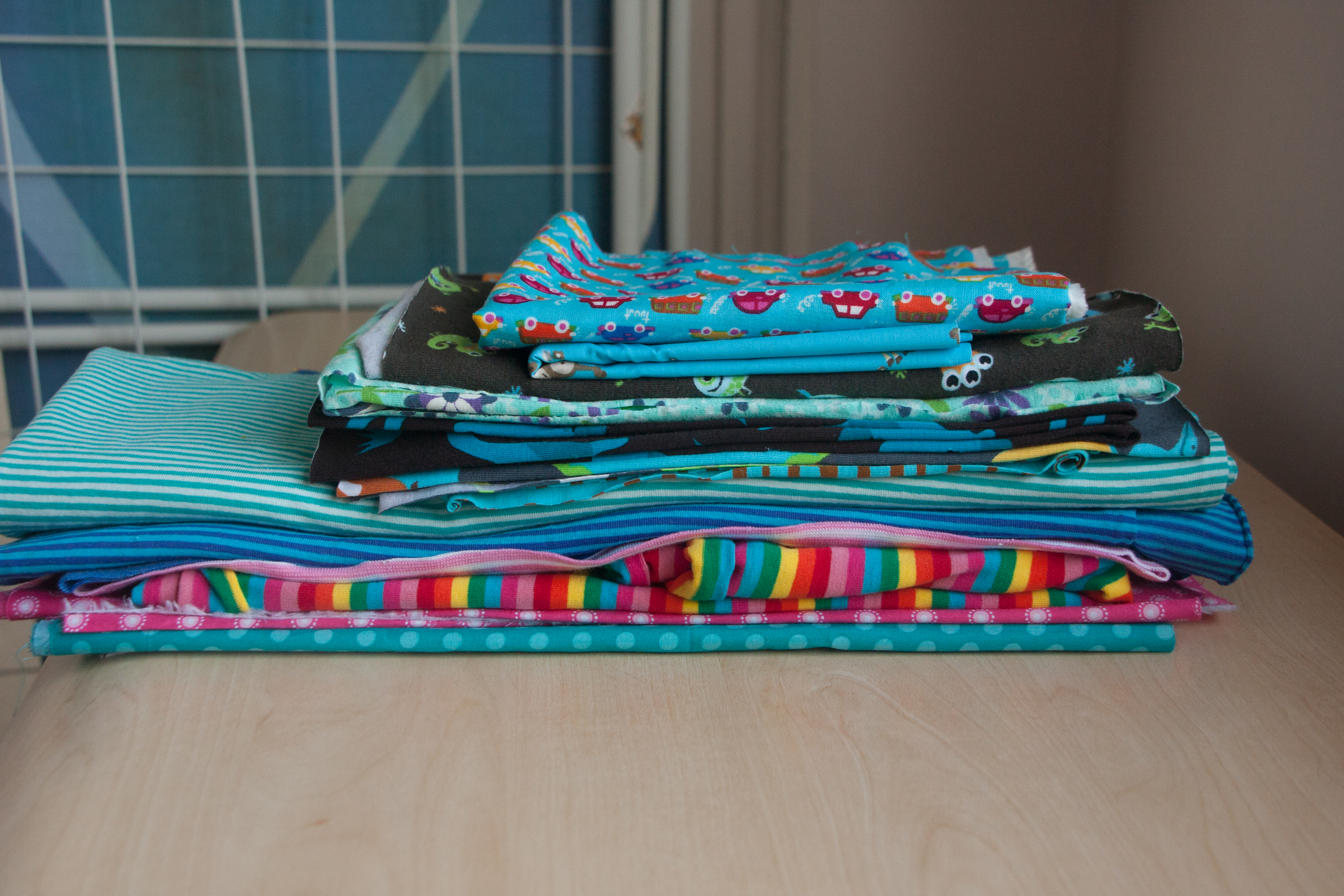 I ordered the “advent calendar for mum with daughter and son” and I could give details about age of children, favourite materials and colours and dislikes and I think i got a really carefully selected choice of goodies ranging from a post card with a sewing related quote over useful tools and pieces of haberdashery to fabrics. And I think it was really worth the money. I do not want to give you a detailed list as this would spoil it for anybody who would ever consider to order the same but just admire this picture of the pile of fabric I have got: