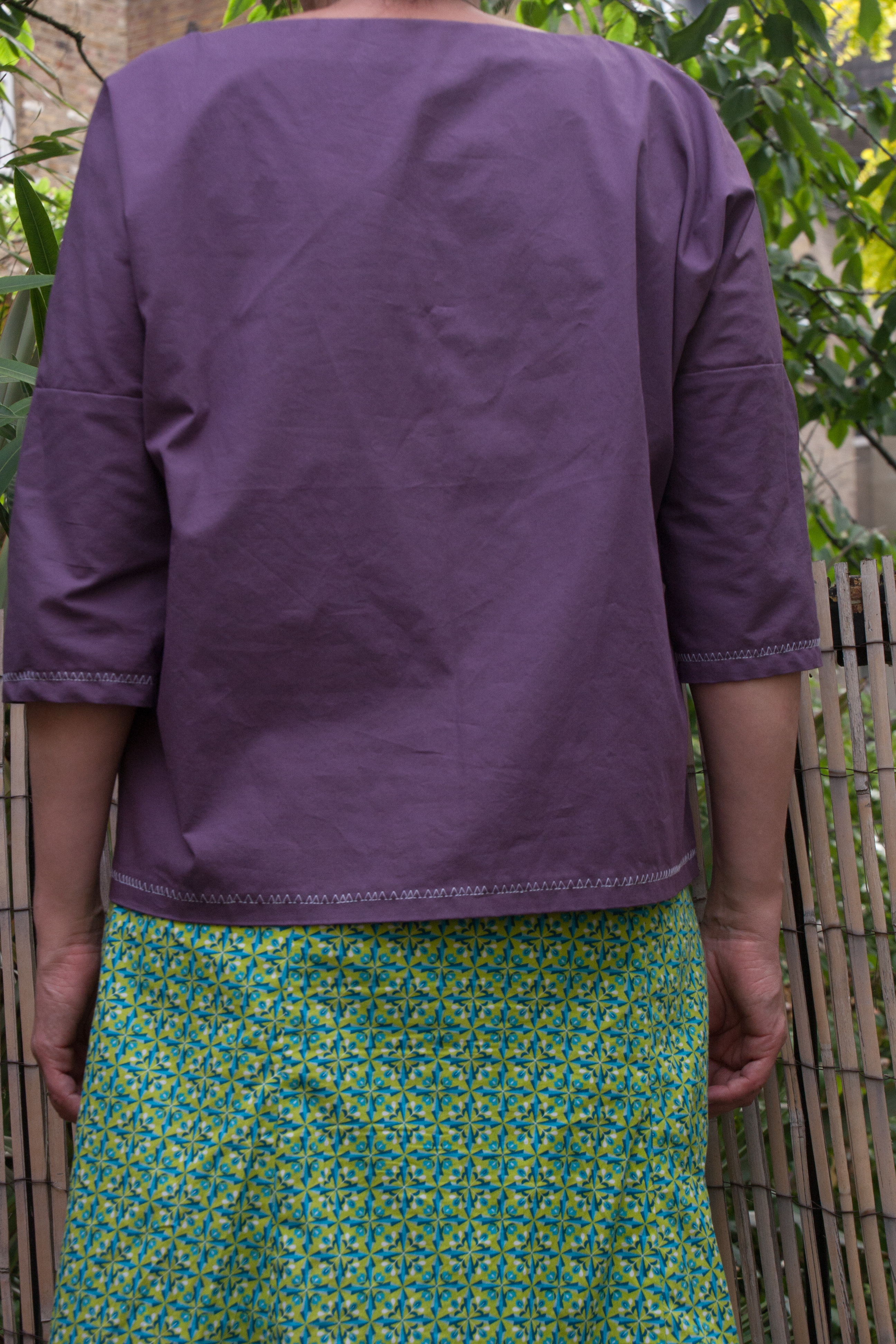 So I used a piece of purple cotton. Frau Aiko is a very simple blouse with straight lines. I find it a bit Japanese style, something I really like. I know Japanese style looks best on slim and petite Japanese women which is why I never wear Japanese style stuff but I still bought the pattern, knowing it might not bring the best out of me. I thought it might actually look cool in a plain colour and with a slightly stiff woven cotton. A bit like linen. Even though that wasn’t what I had initially in mind.