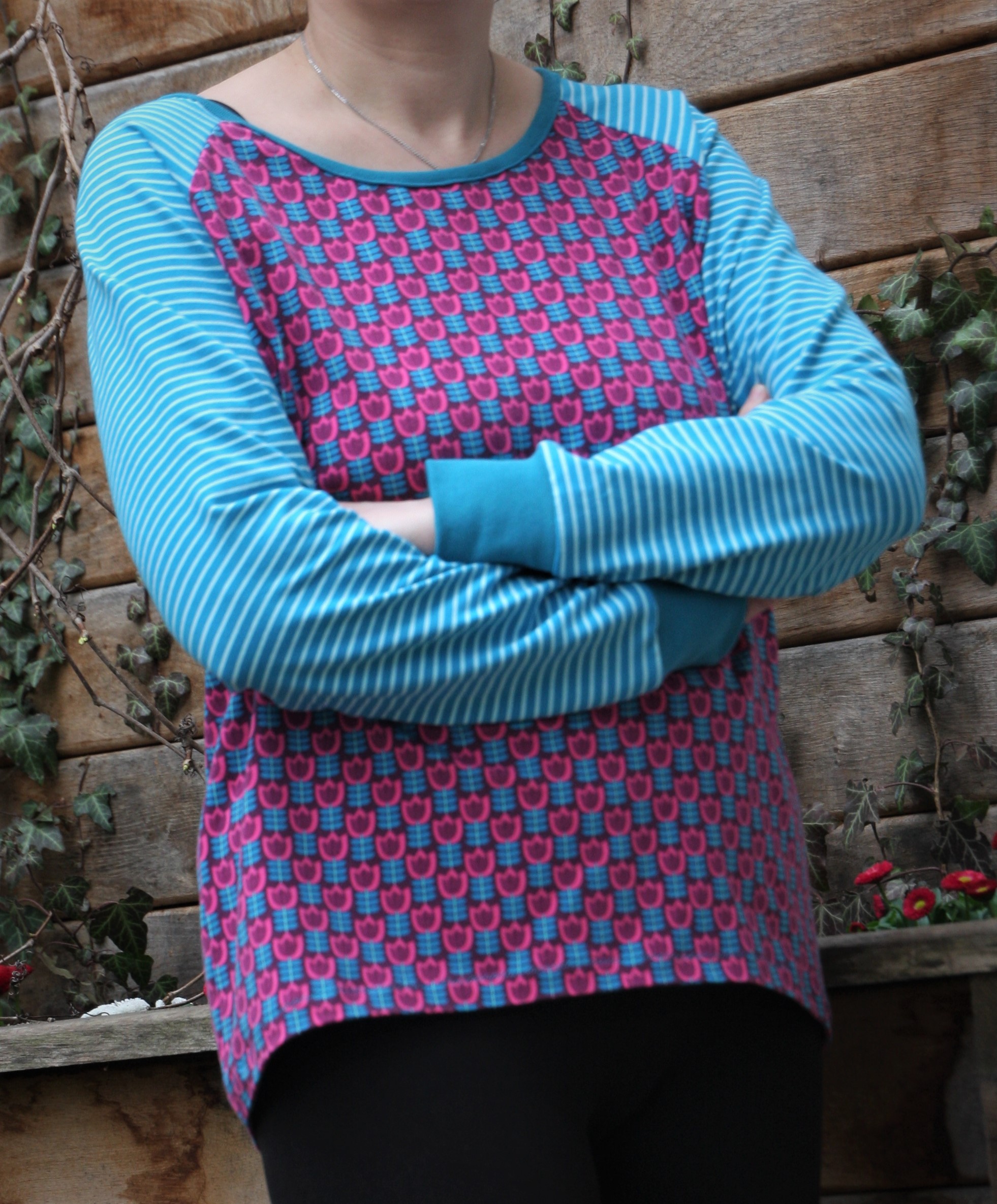 Since my last post about tops and T-shirts, I have managed to make a few more. I haven’t managed to adapt the pattern the way I wanted though. I meant to change the raglan line but failed. Very confidently I did cut the good fabric though. Then I had a little crisis. Then I tried to at least safe it and could actually still use the pieces and cut again following the original pieces even though it meant that I had to shorten the front and back.
