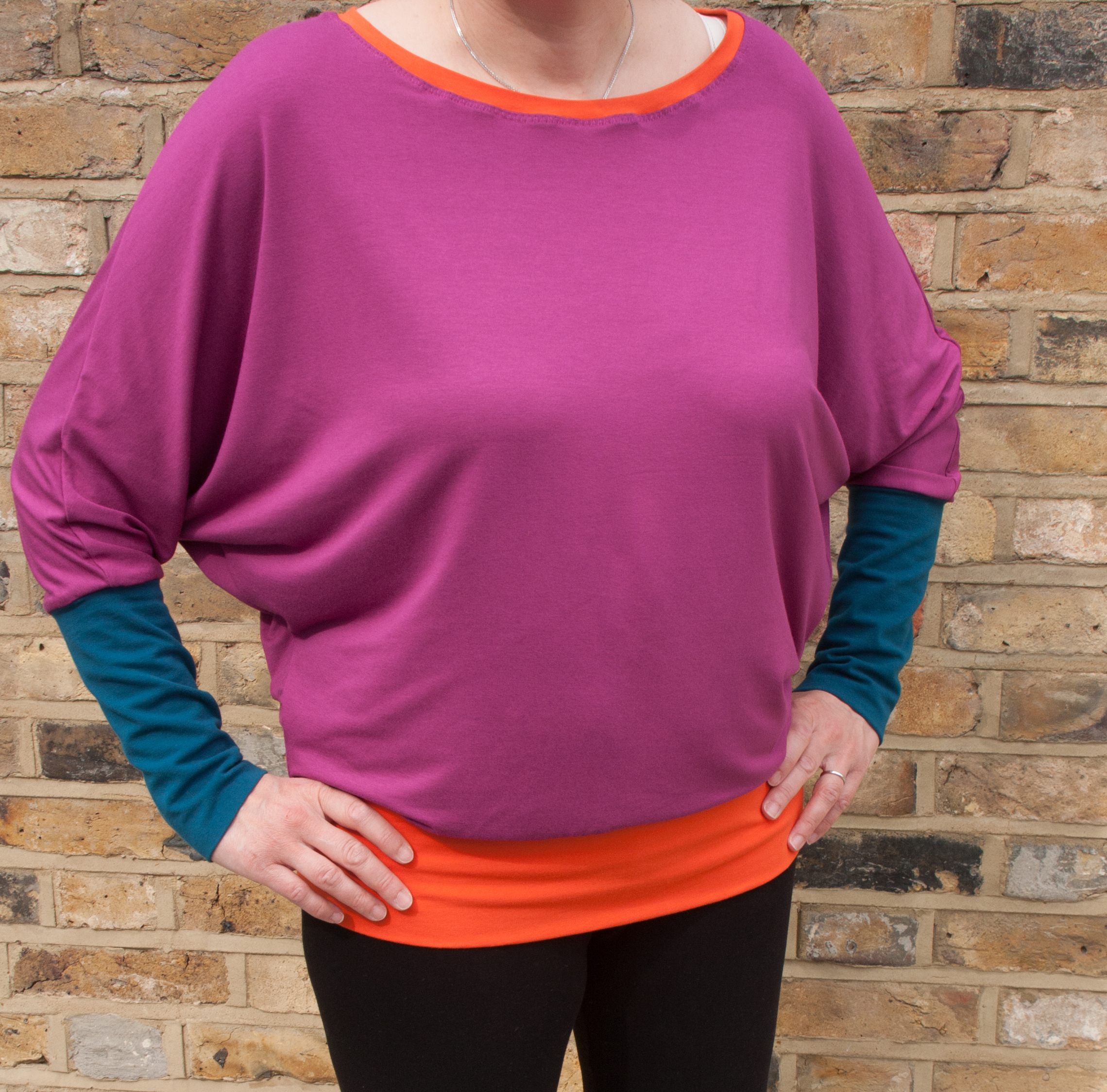 But then I realised that the left overs of the plum-magenta (not sure how you would call this colour), bought at least two years ago, might just be enough. I would need some stretch jersey for neck, hemline and cuffs though and found a bit of orange and a bit of teal. What a coincidence. If not a sign. Could we say that this is my all time favourite colour combination?