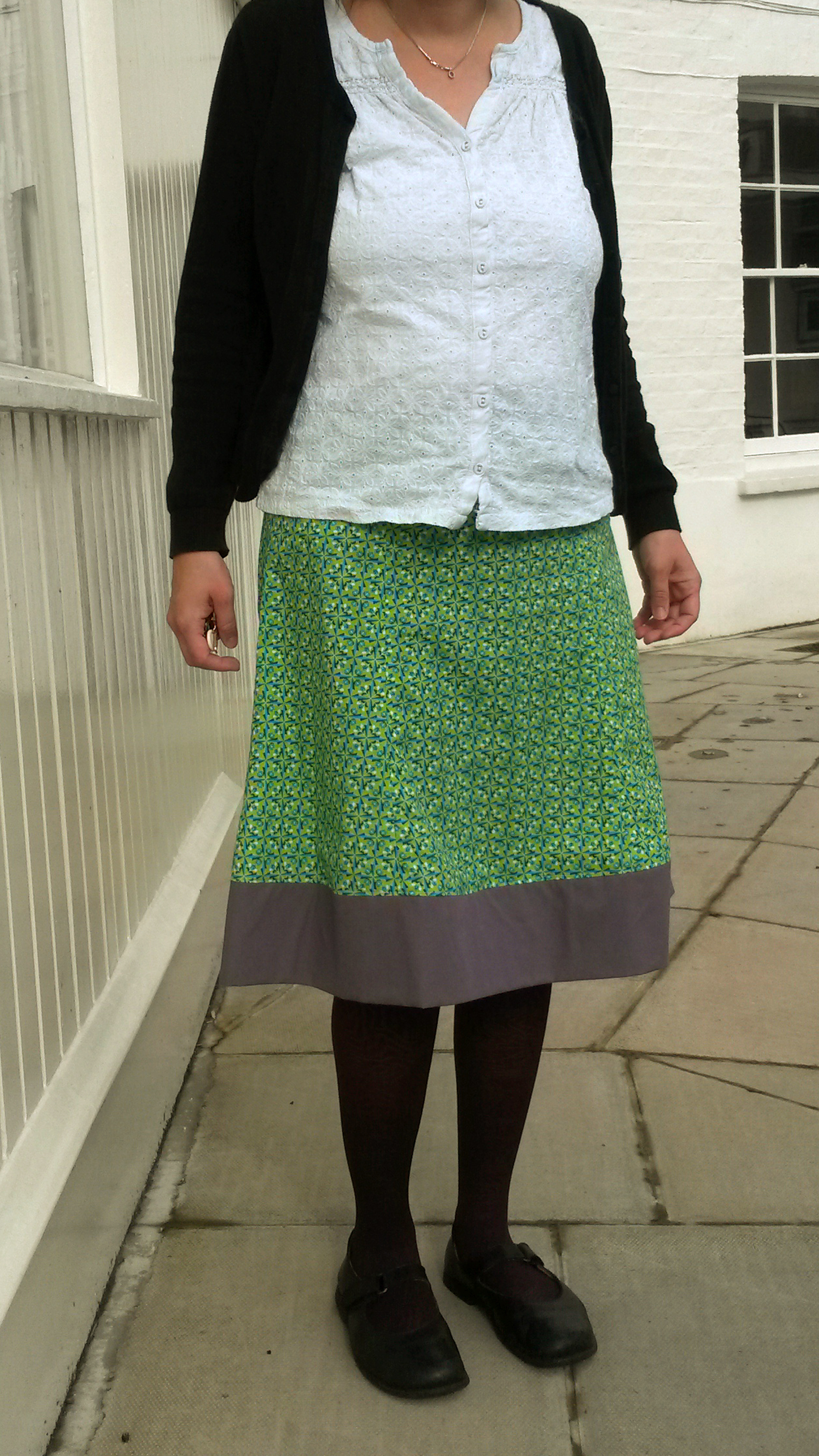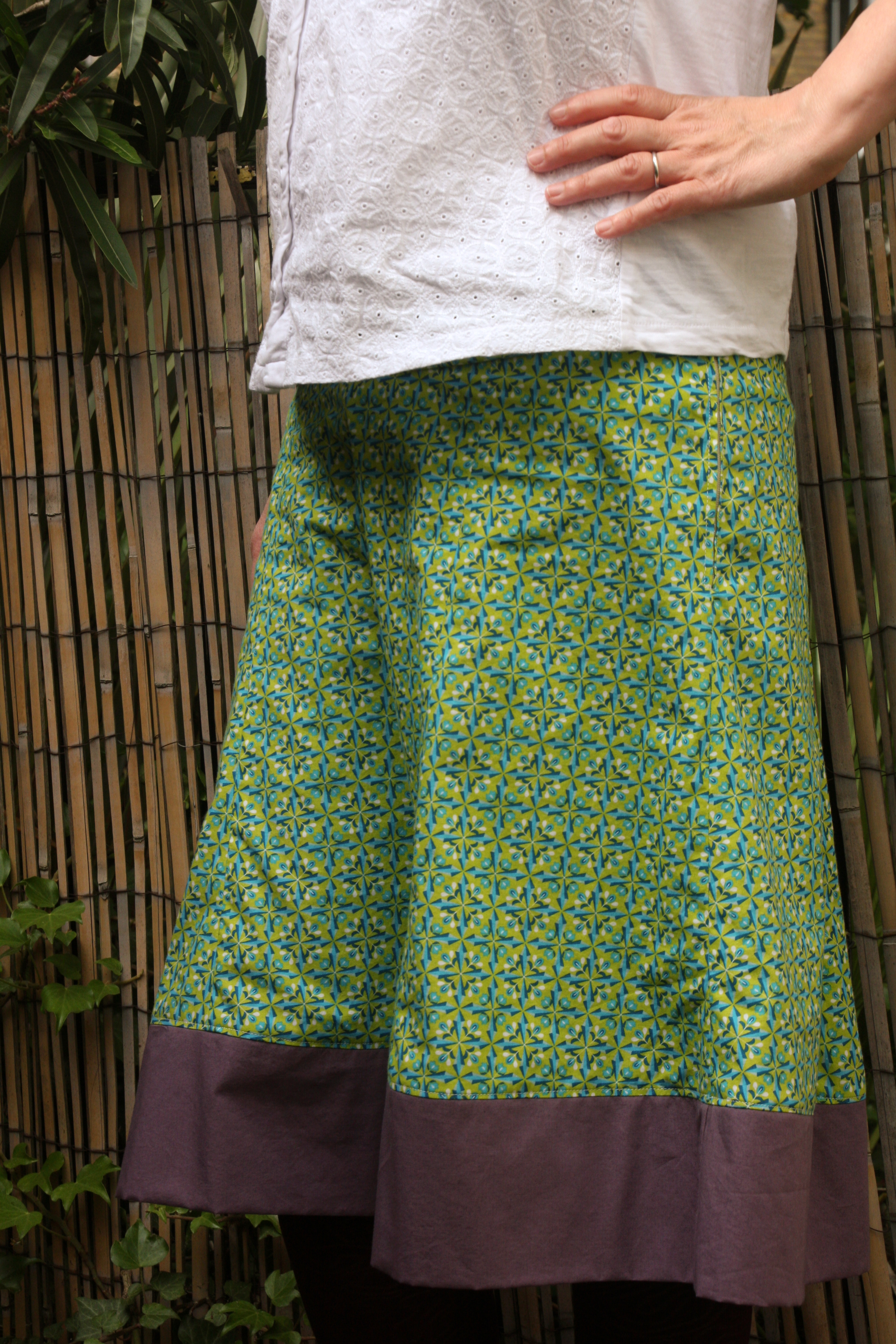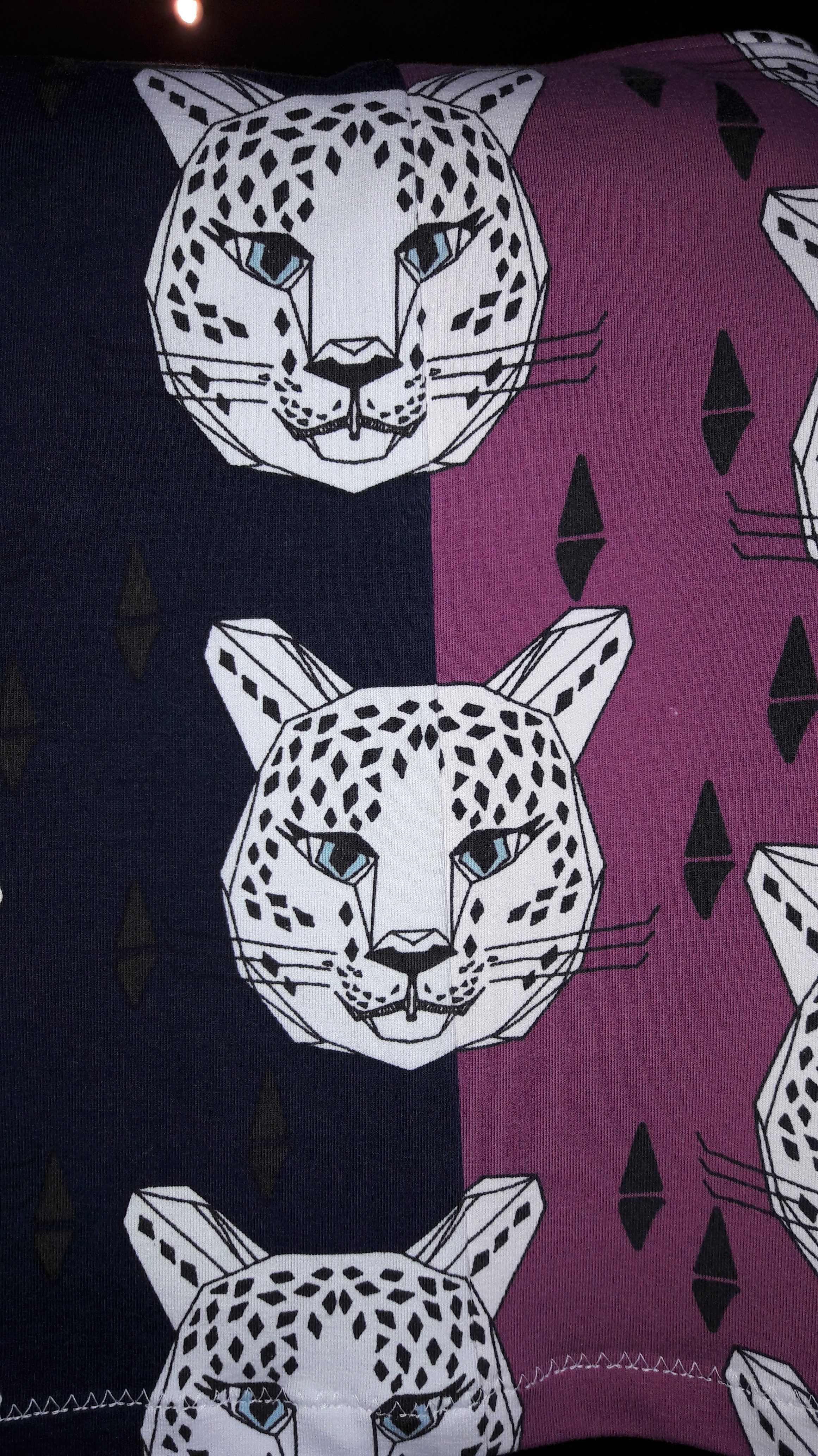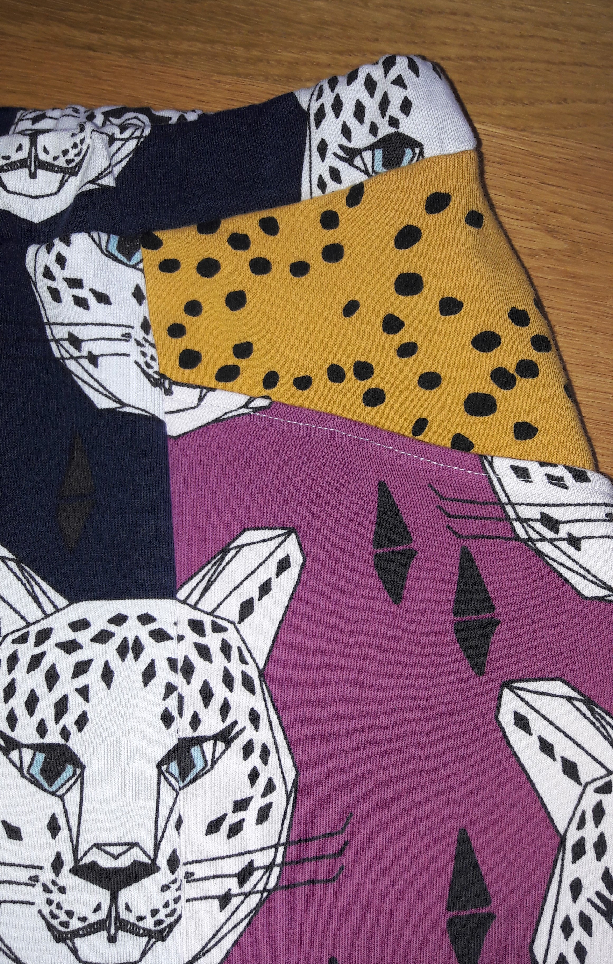So, I took my pattydoo Carol dress pattern and used just the skirt part of it. And the left overs of the leopard jumpers. I intended to use only the navy one but I could not match the pattern. The thing with big patterns is that one should really match them at seams. When I started sewing, I just tried to cut out as economically as possible. In a first step I realised it would make sense to match stripes at side seams or to place bigger motives in a sensible, symetric, way even if it means that you are loosing a bit of fabric. This time I took it rather seriously and made sure that the front pieces were perfectly matched. (well, I did my best). On the side seams it wasn’t possible as I didn’t want to loose the A-line. Or 5kg. And unfortunately, I didn’t even try to match the waist band. I was already so pleased with my skirt that I got carried away and cut before thinking. Anyway, my perfectly wearable and age appropriate (mentally “5”) leopard (or whatever wild animal it might be, I am not a zoologist) print skirt: