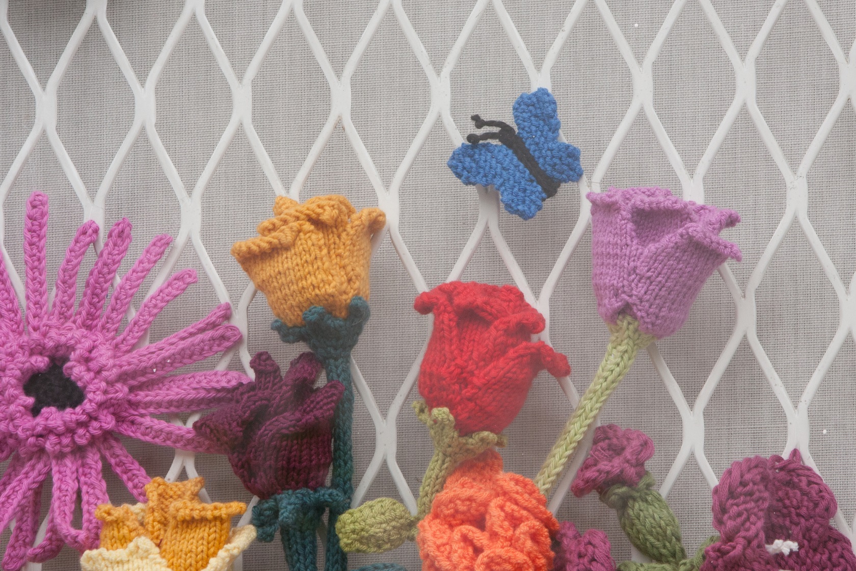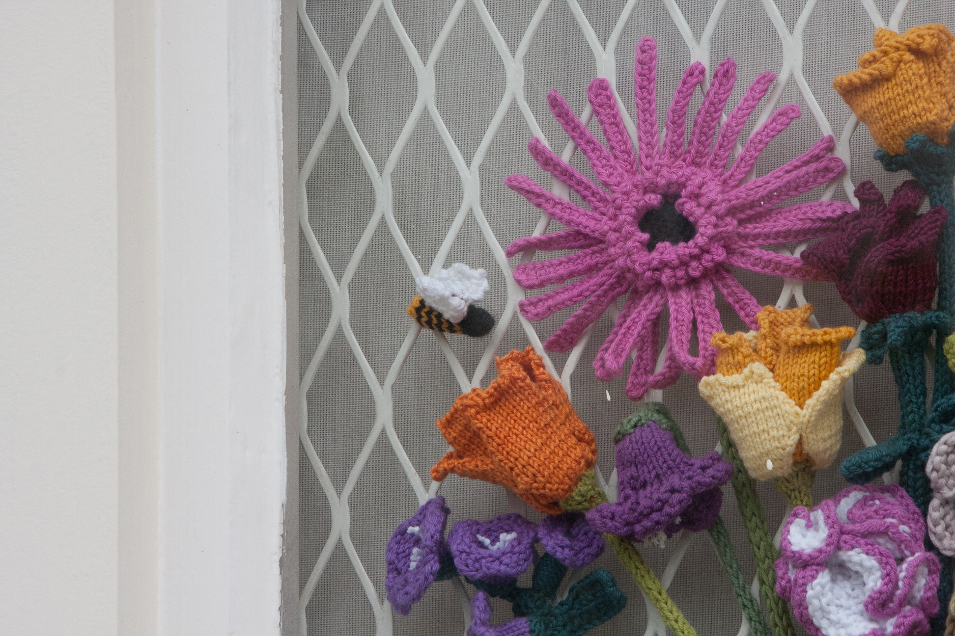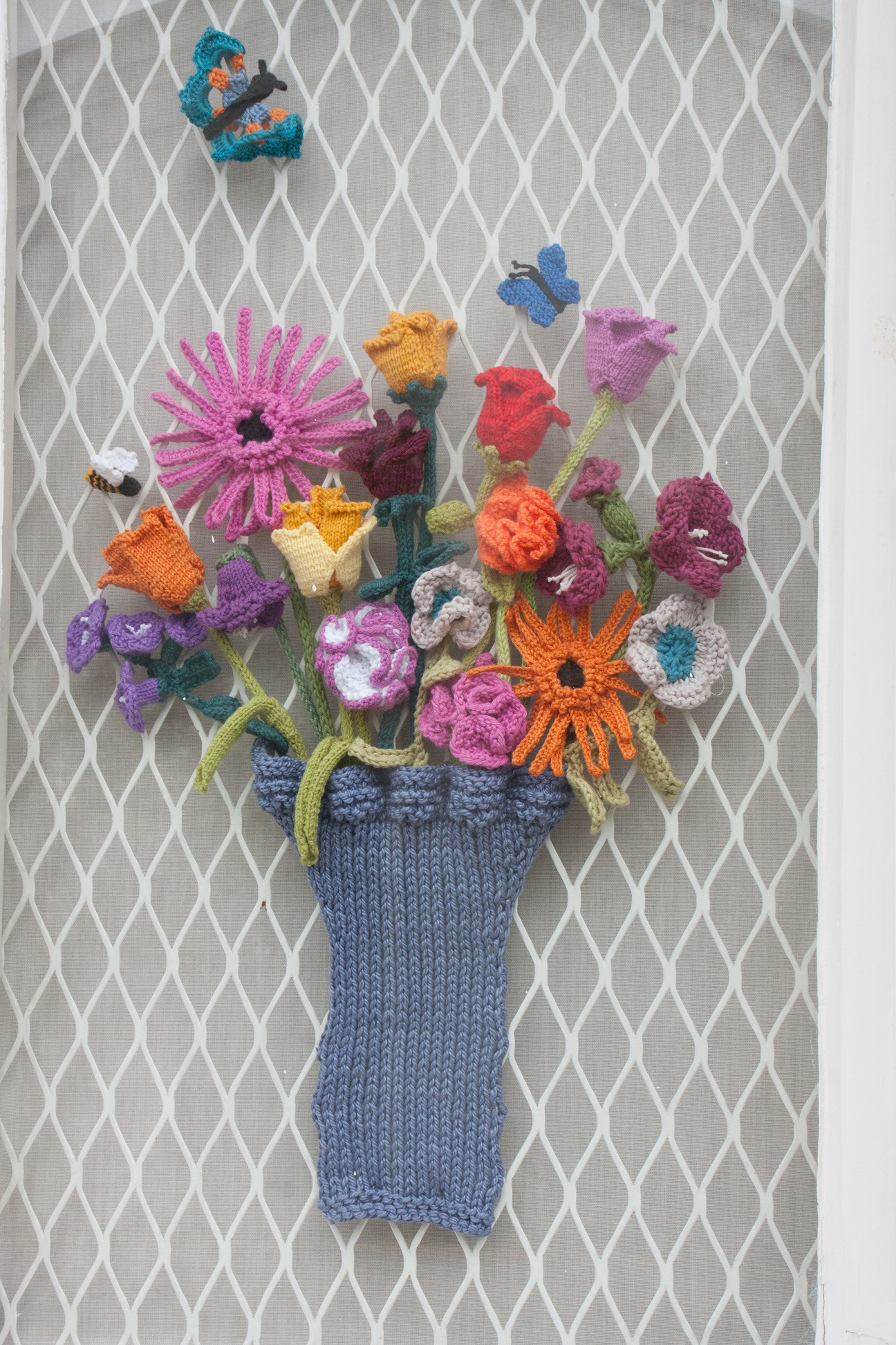 To make this waiting time more exciting, I have started to decorate the house, starting with the window display. Remember I used to have flowers in there and lately I was wondering what to do with them as they get damp now in Winter. (I must admit, on the first morning with a wet window I tried to give them a blow dry). They would not have survived the whole winter. So the christmas posts by the twisted yarn came in handy and I stole adapted her idea of a knitted wreath.